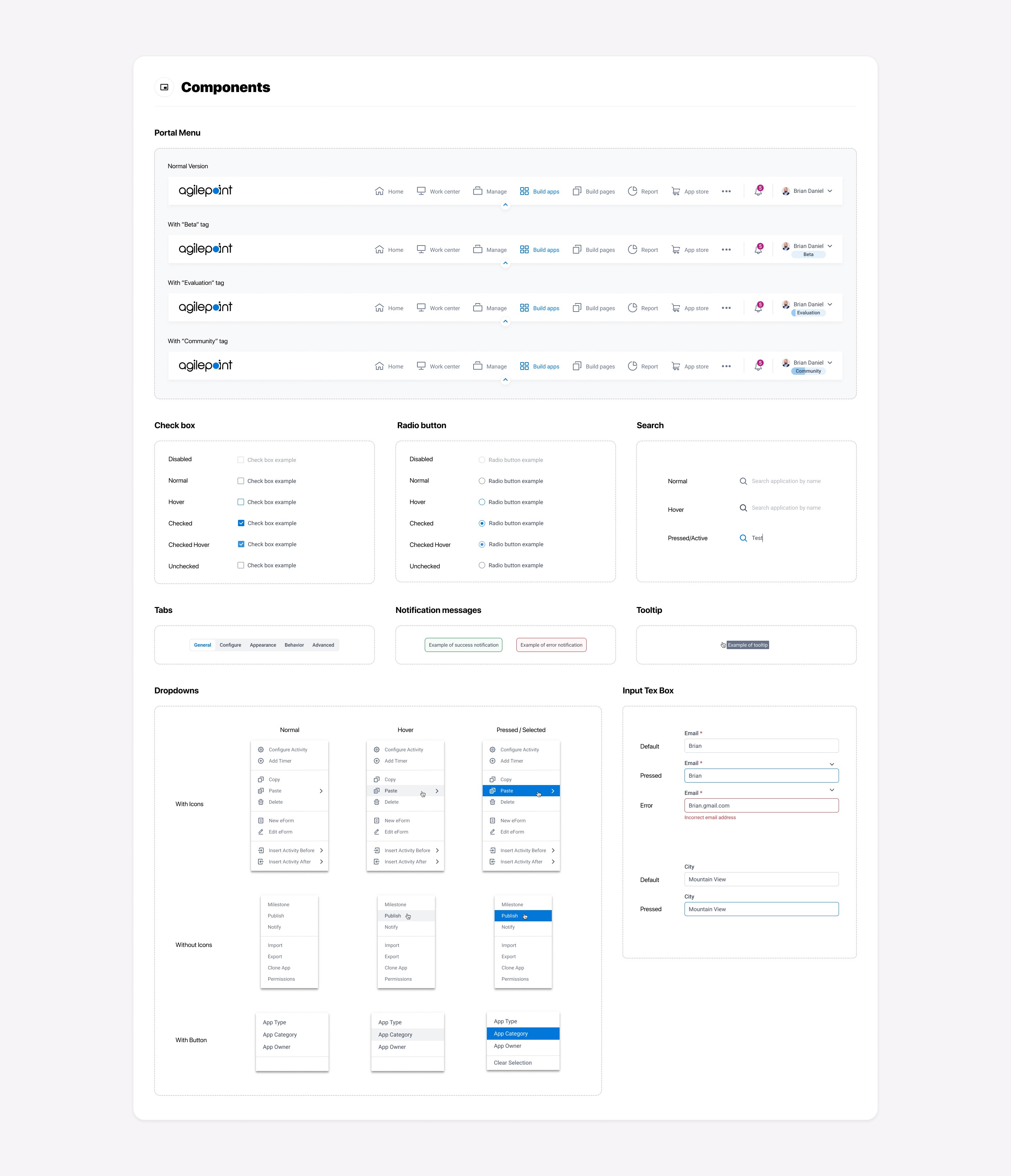In 2016 AgilePoint launched AgilePoint NX v6.0, and for the next few years, the separate teams created their own unique styles without having any documentation and guides. The product got a lot of inconsistencies. When I join to the company in 2019, I started defining how to improve the end-to-end design process to increase the usability and consistency of the current product. After discussing with cross-platform teams and stakeholders, we decided to redesign the AgilePoint NX platform. As a starting point, I initiated and led the creation of the first Design system that also helped build better collaboration and communication between teams.