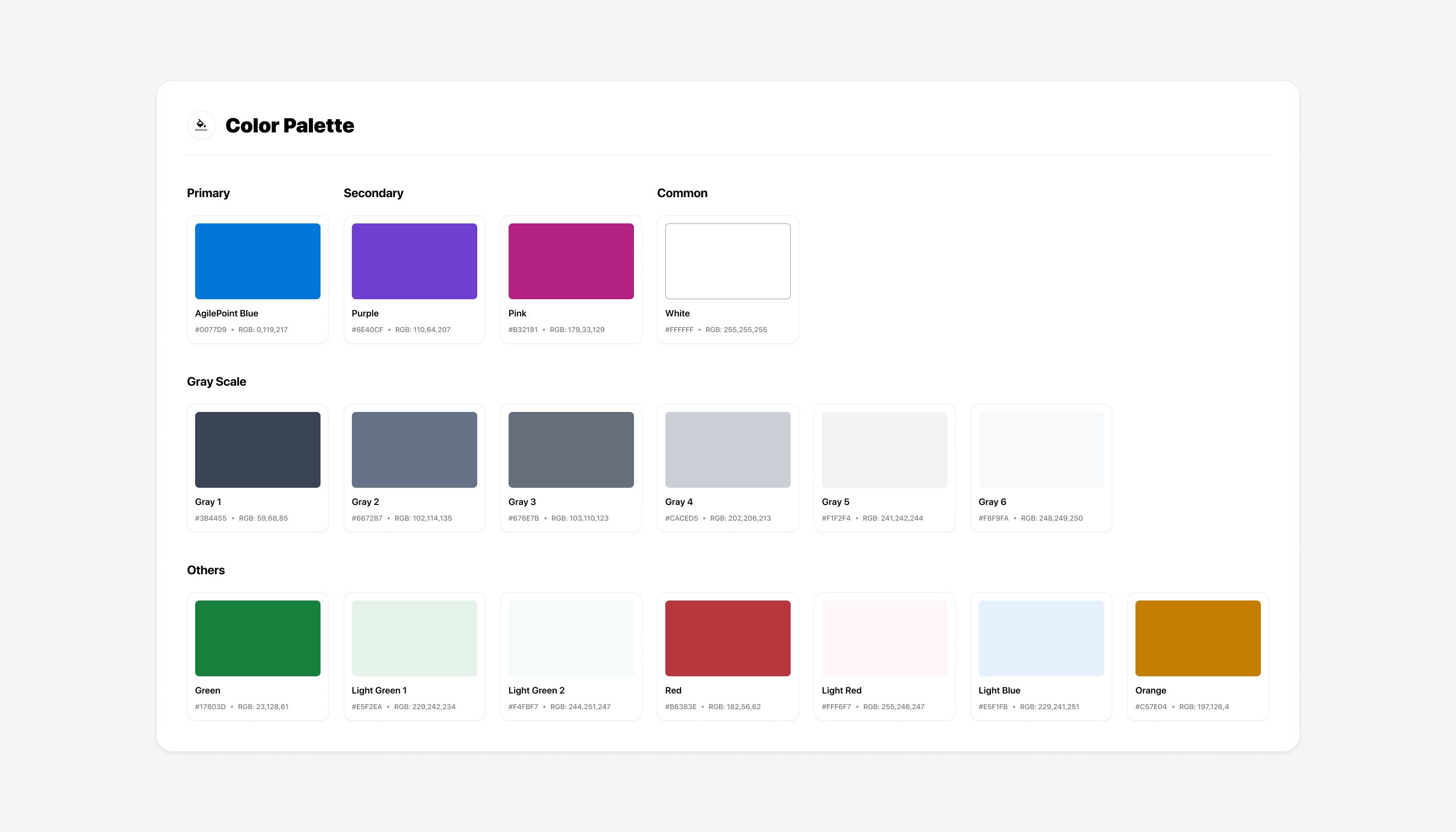 We decided that this was an excellent time to refresh the color palette since one of the main problems to solve was to ensure the colors passed the accessibility contrast test so that “EVERYONE” would have a better experience. Also, we wanted to help guide the user to important elements on the screens by new refreshed colors that provide a bit of pop that feels lively. I defined AgilePoint Blue as a primary color because it builds trust, a feeling of loyalty, reliability, and responsibility.