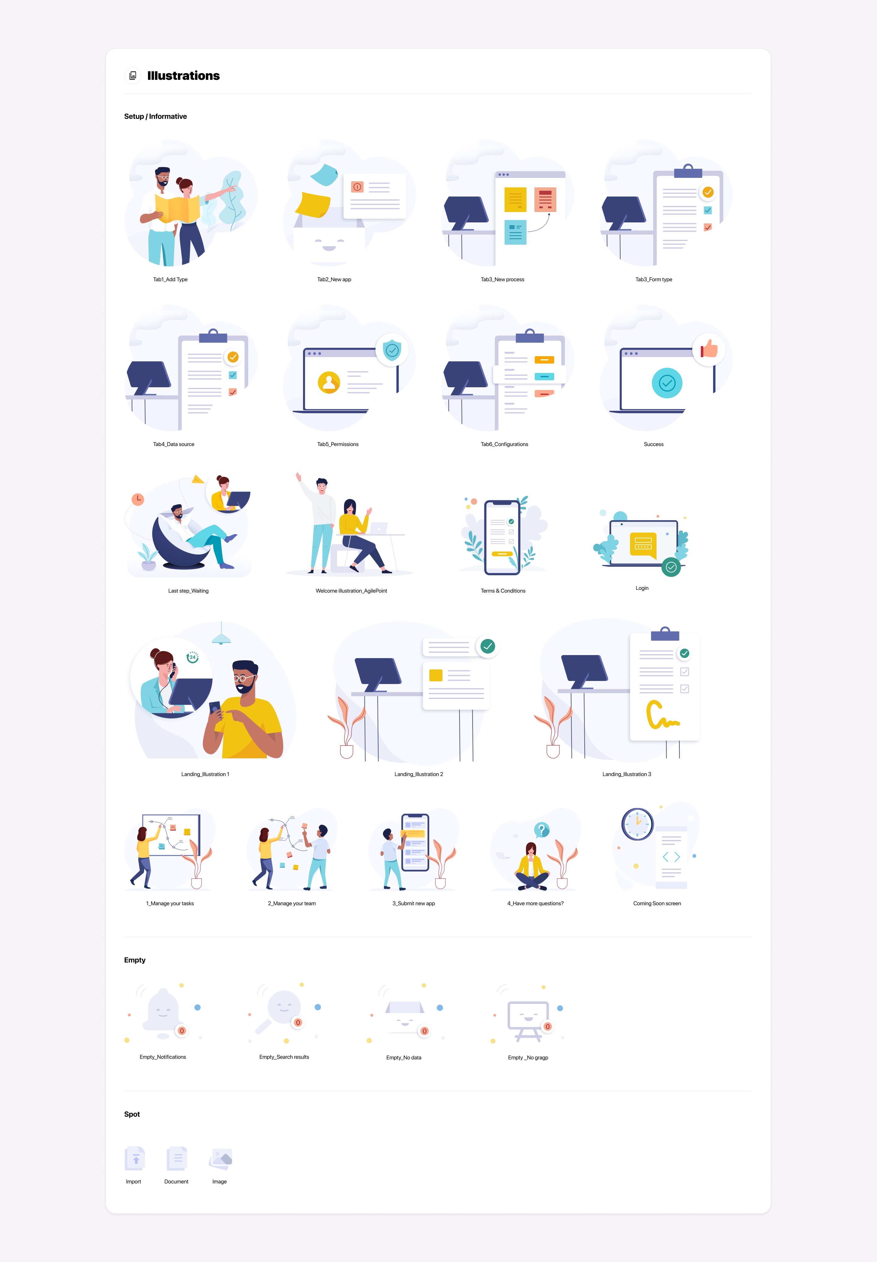 As part of the Design System, I initiated creating illustrations with the hope of bringing more visual language and personality to the product and delight and emotional connection with our customers. I defined three types of illustrations as "Setup/Informative," "Empty," and "Spot":