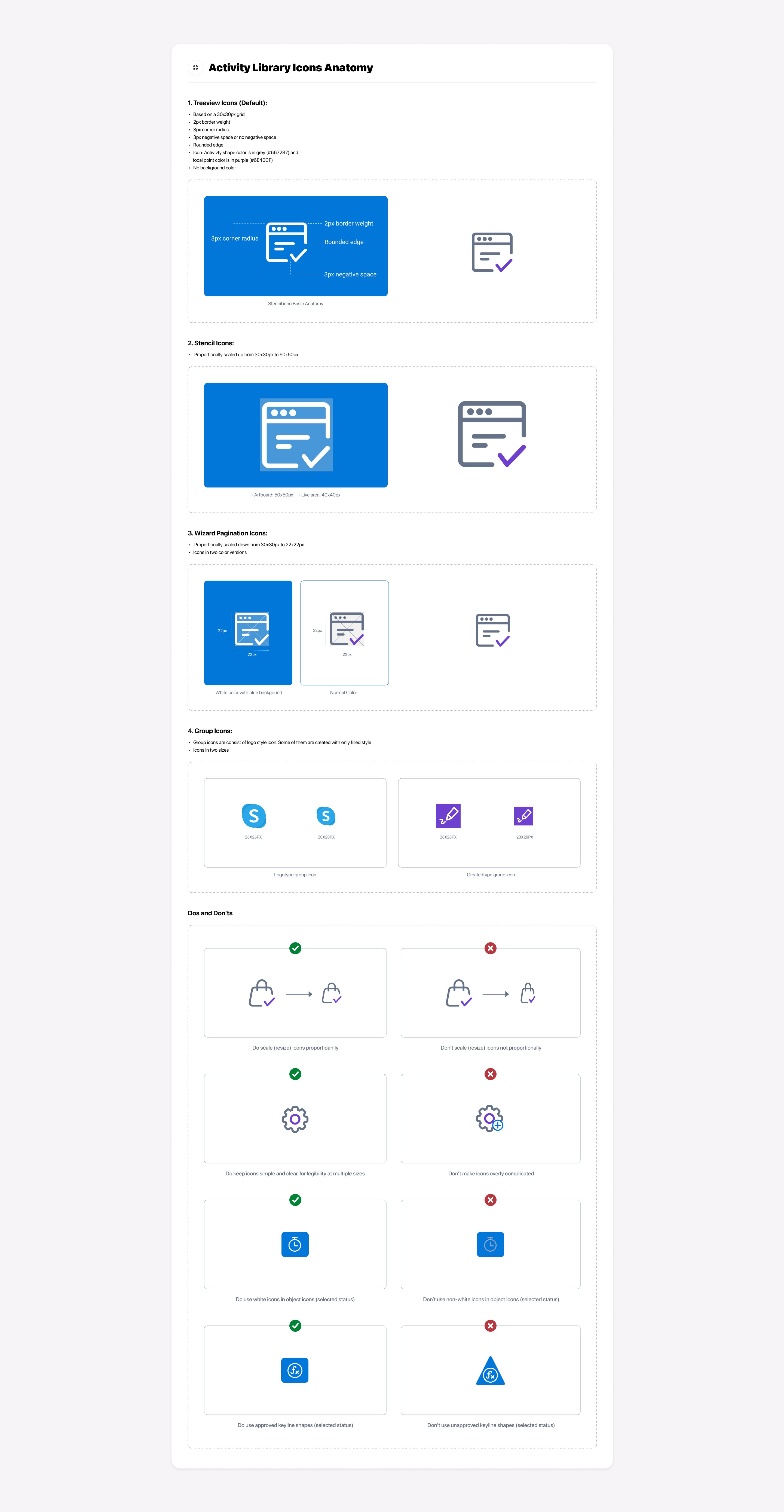 One part of our product contains an activity library section that includes about 50+ categories, and each of them has Utility icons that identify labels. In total, there were about 450 of them. They weren't consistent regarding varying shapes, styles, and designs. After a discussion with a team, we decided to redesign all of them. To ensure that we will have consistency in the future, I initiated the creation of Icon anatomy since the total number of icons is increasing from time to time.