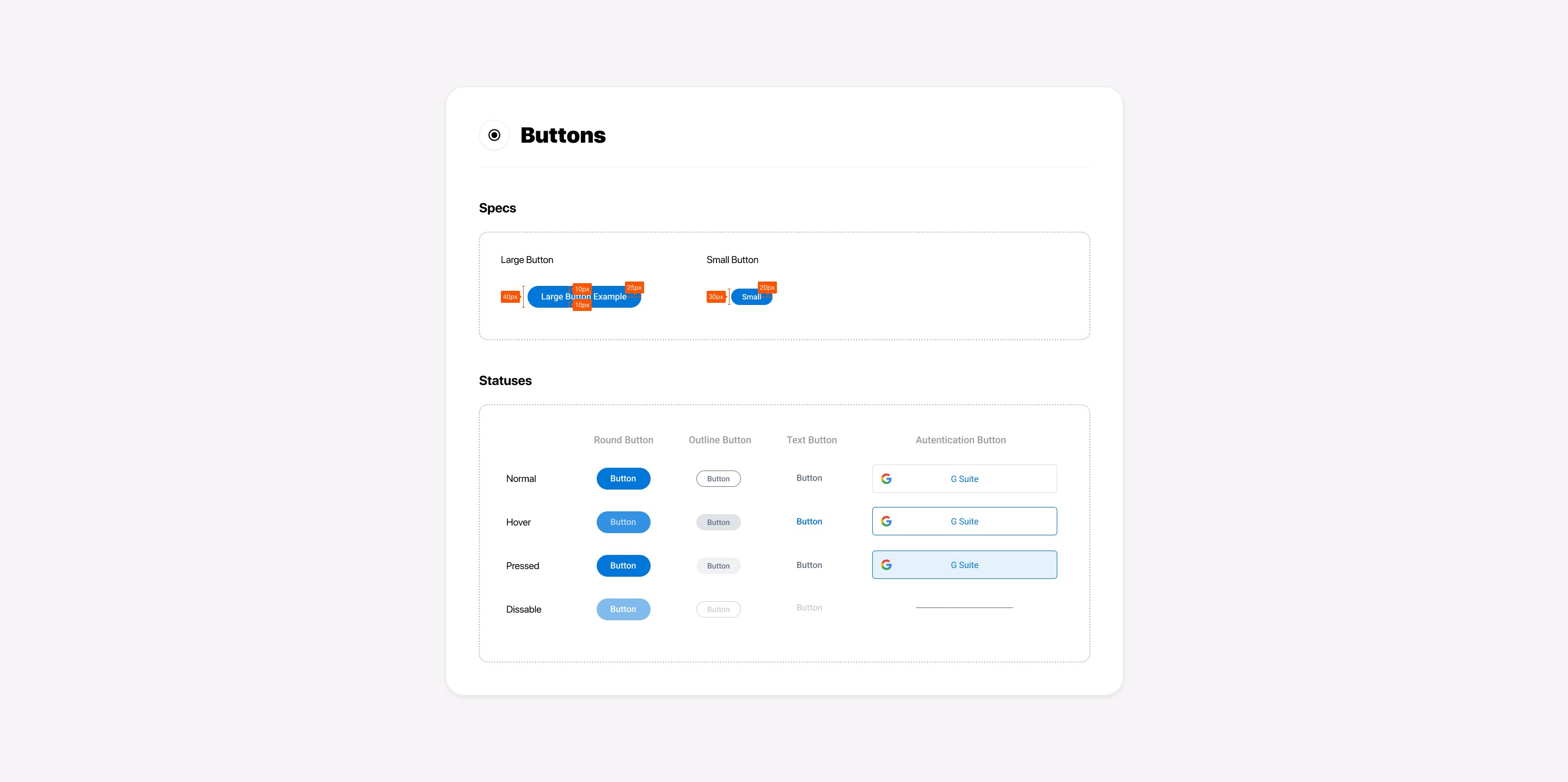 One of the main problems was that the user didn't get feedback on the interactive button (no hover, no pressed states, etc..), which led to confusion. I defined a total of 4 button states to improve user interaction. I also divided recent buttons into the Round, Outline, Text, and Authentication categories to decrease visual variances that are not necessary.