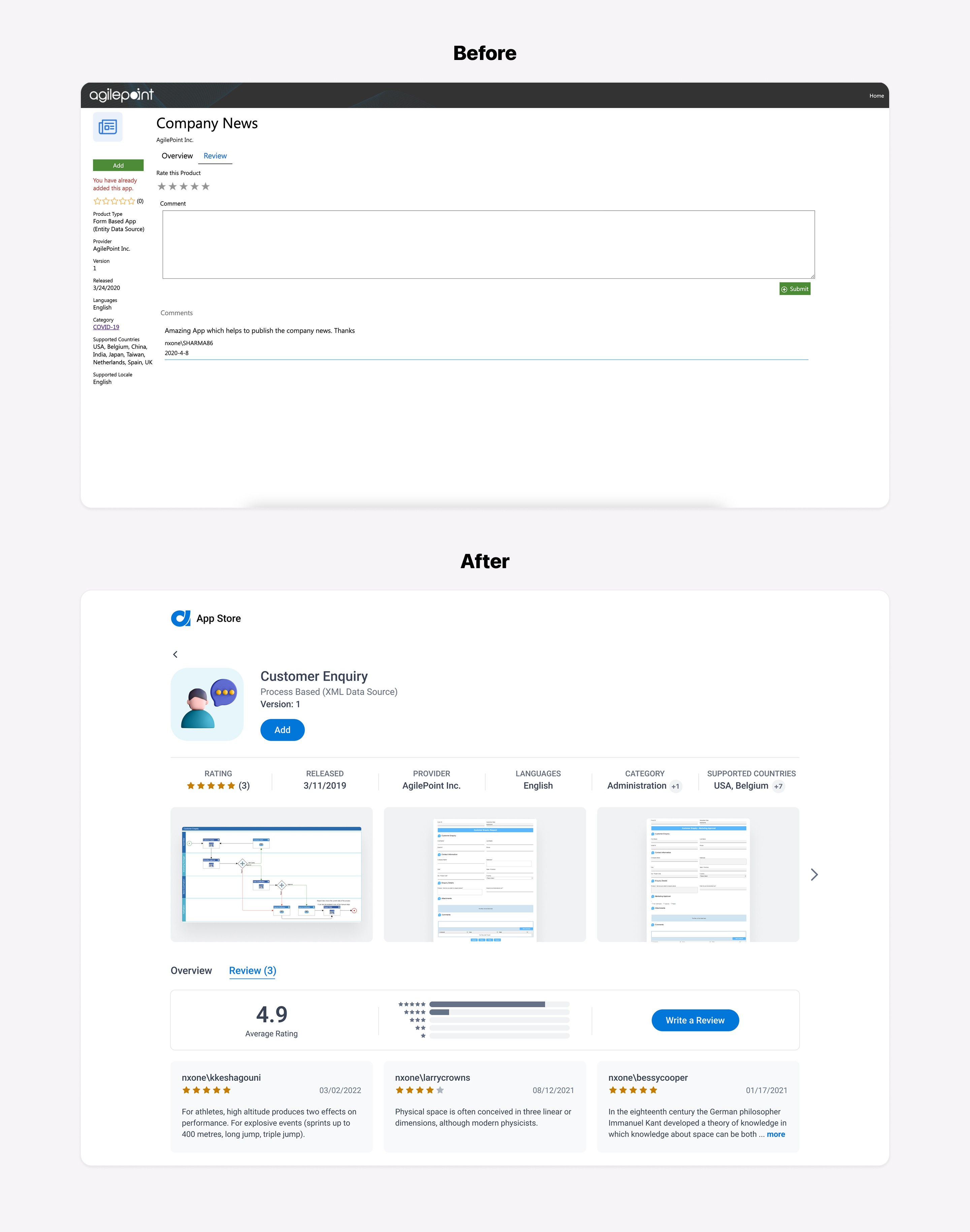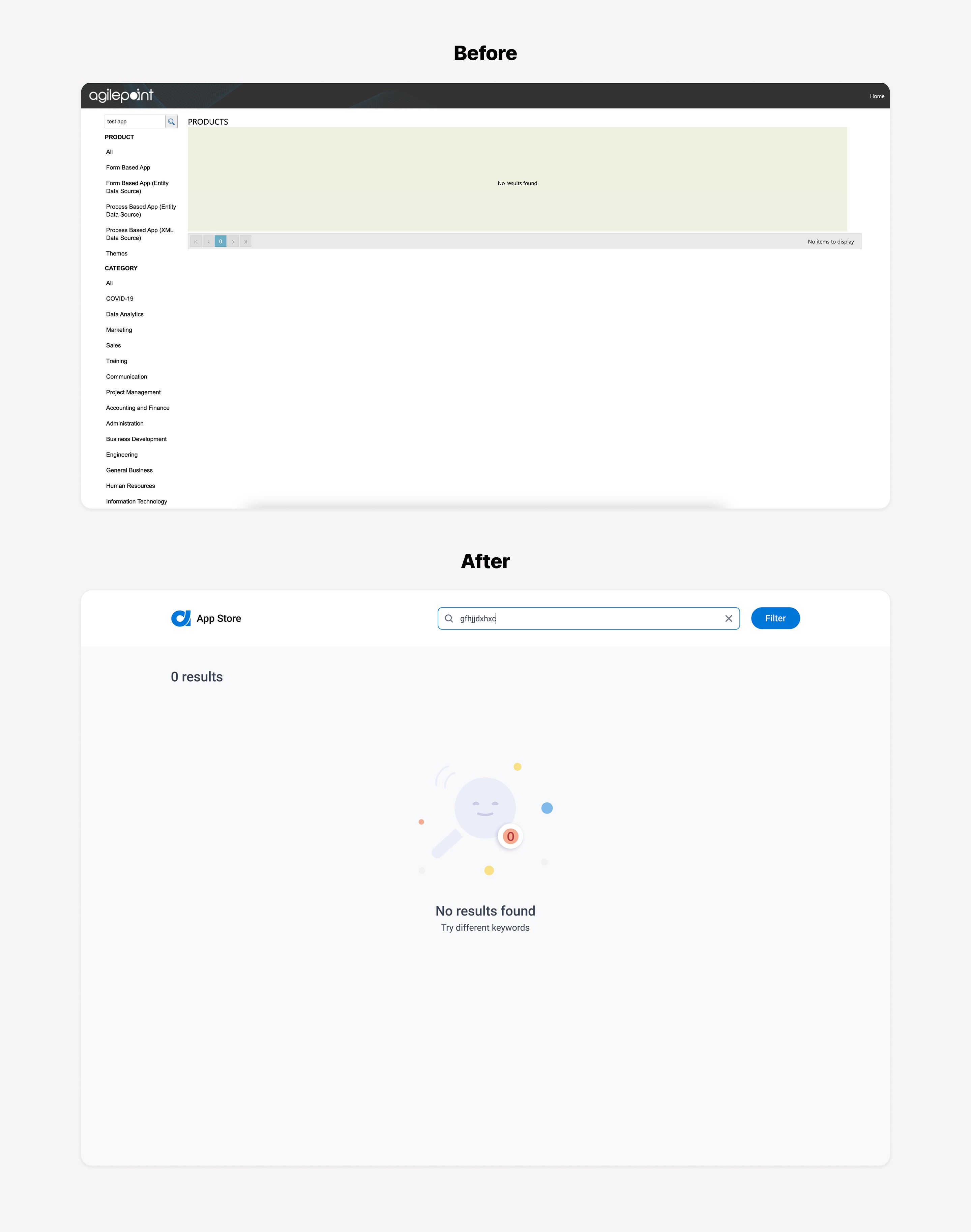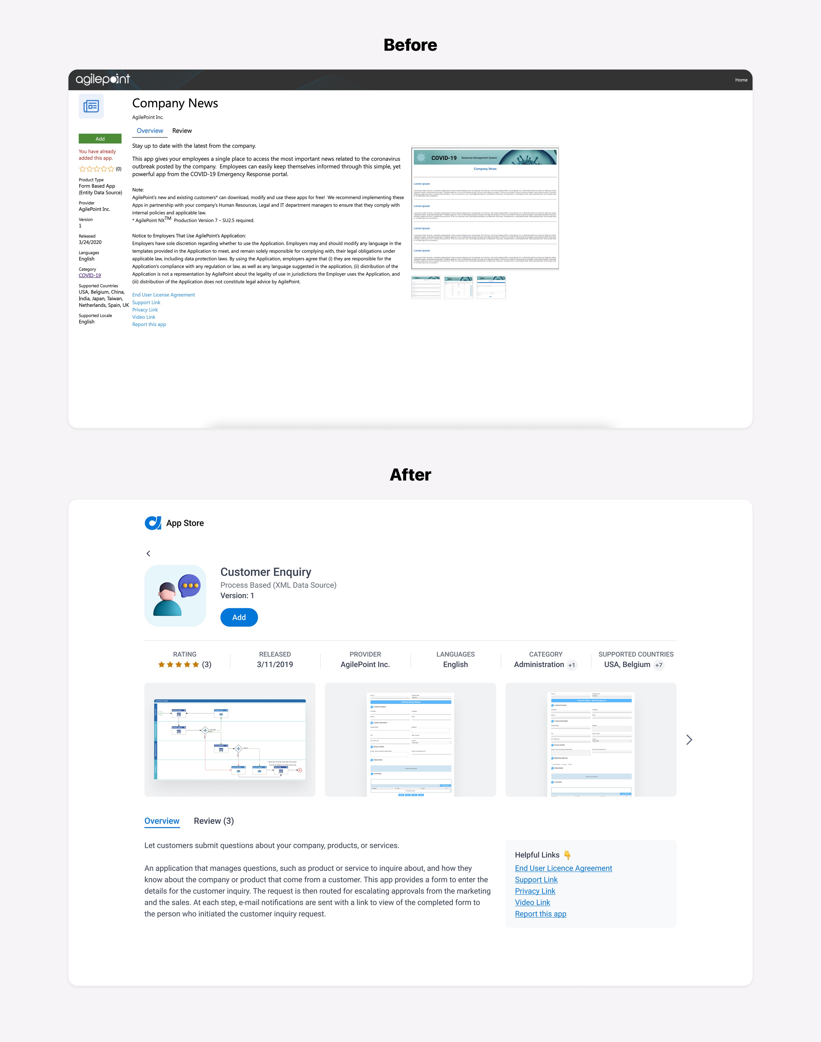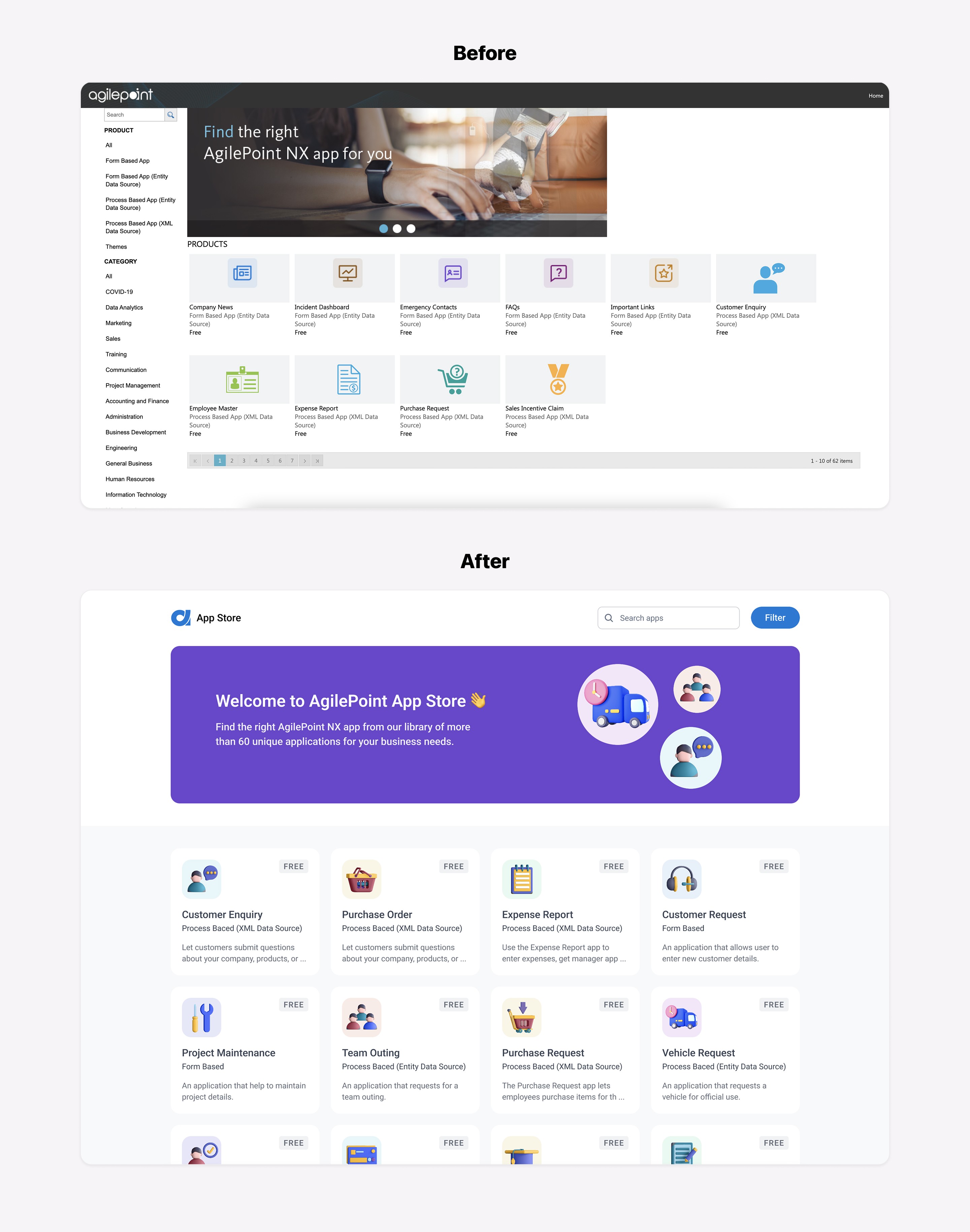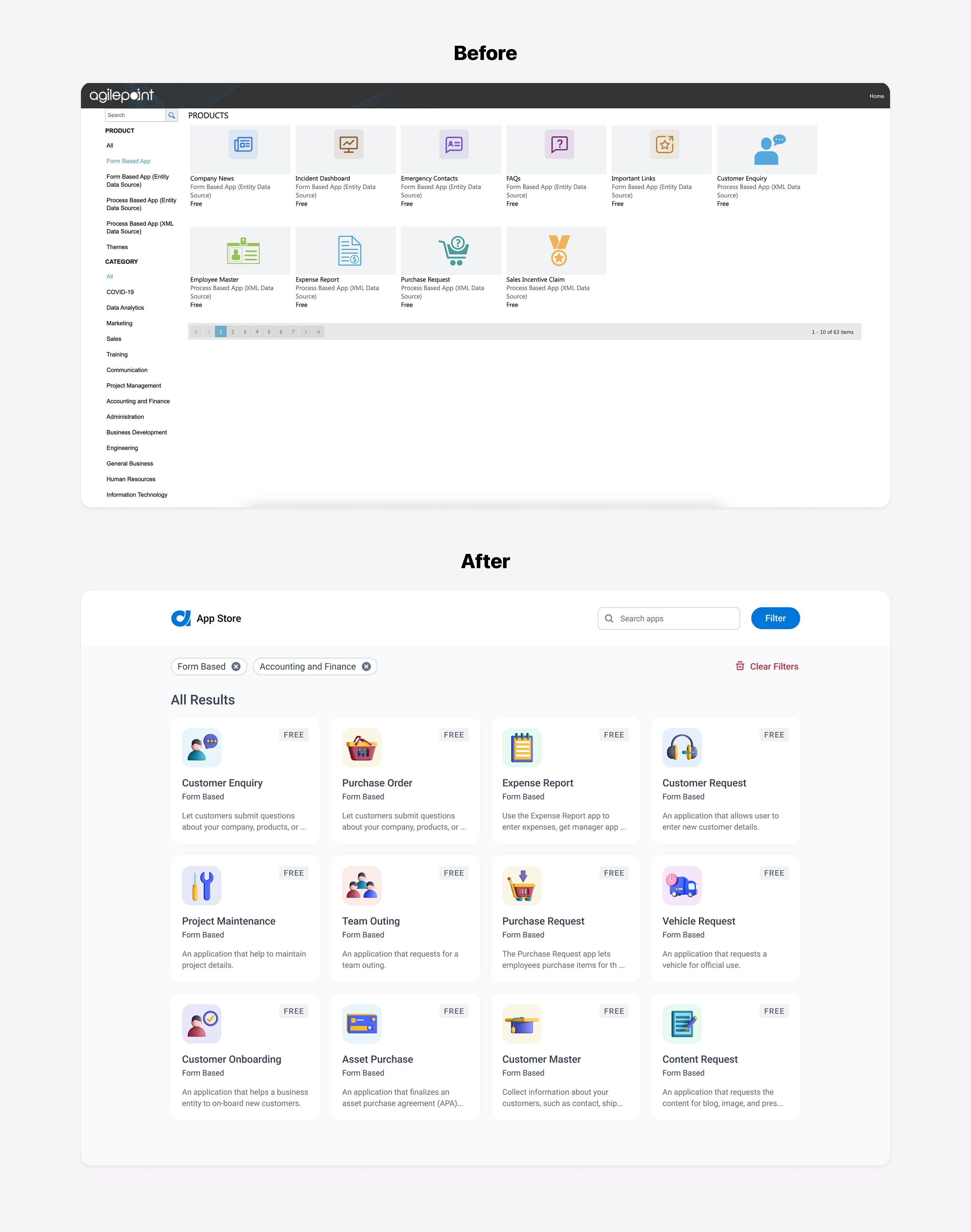After completing this project, it's clear that updating the UI and improving the usability and consistency of the AgilePoint store were critical steps in enhancing the user experience. By aligning the design with the new branding and making the product more intuitive to navigate, we were able to create a more enjoyable and efficient tool for users. We hope these changes will increase our users' satisfaction and productivity. Overall, this project was a success and we are confident that these improvements will have a positive impact on our users.