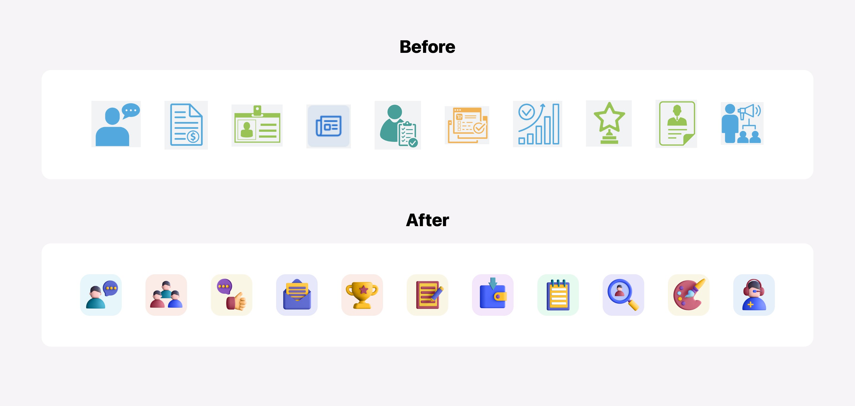 The store had over 60 app icons that were inconsistent in terms of style, size, and design. In order to create consistency and give the icons a fresh new look, I suggested to the team that we redesign all of them with the hope of creating a delightful and emotional connection with our customers. Below, you can see a comparison of the before and after: