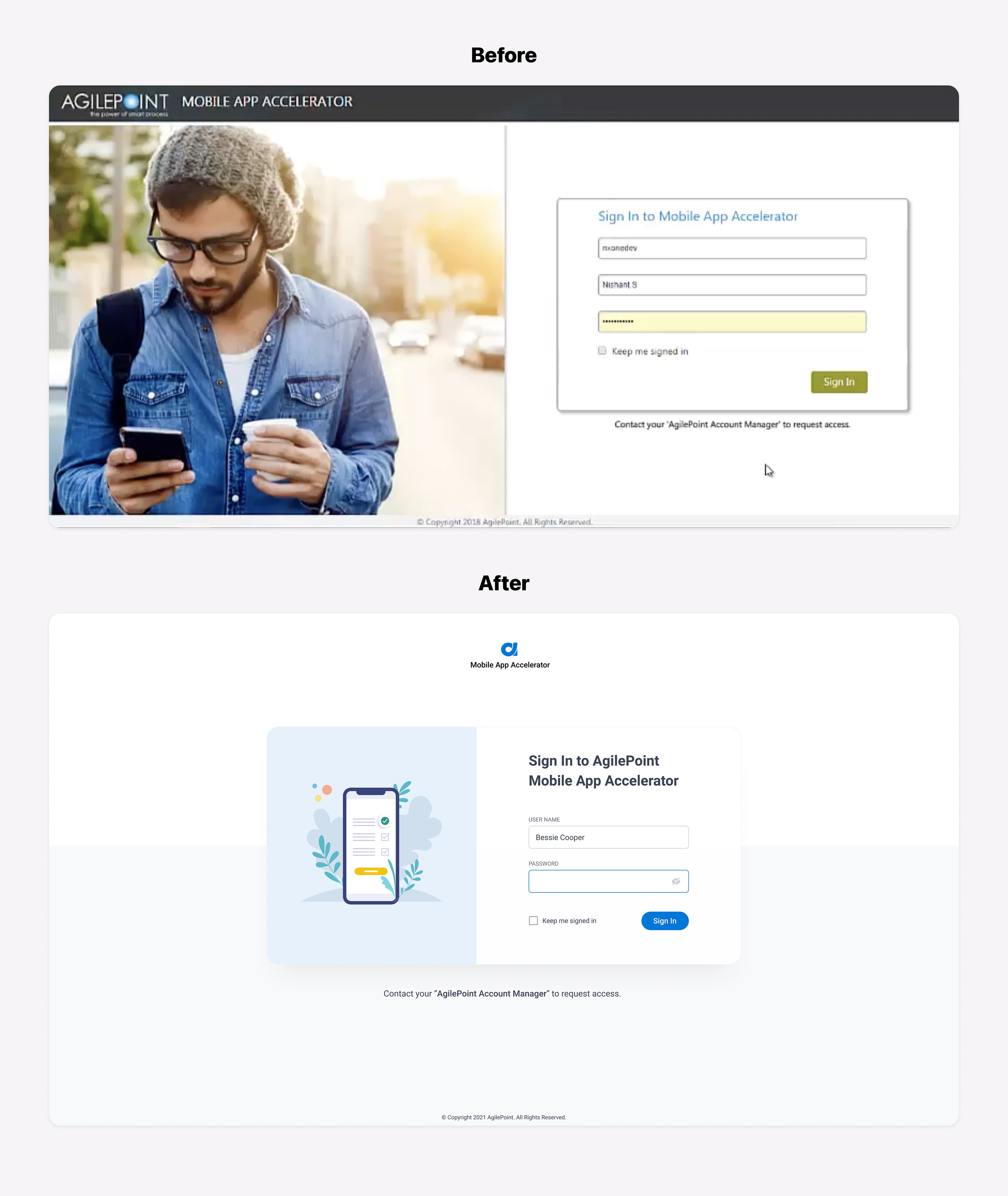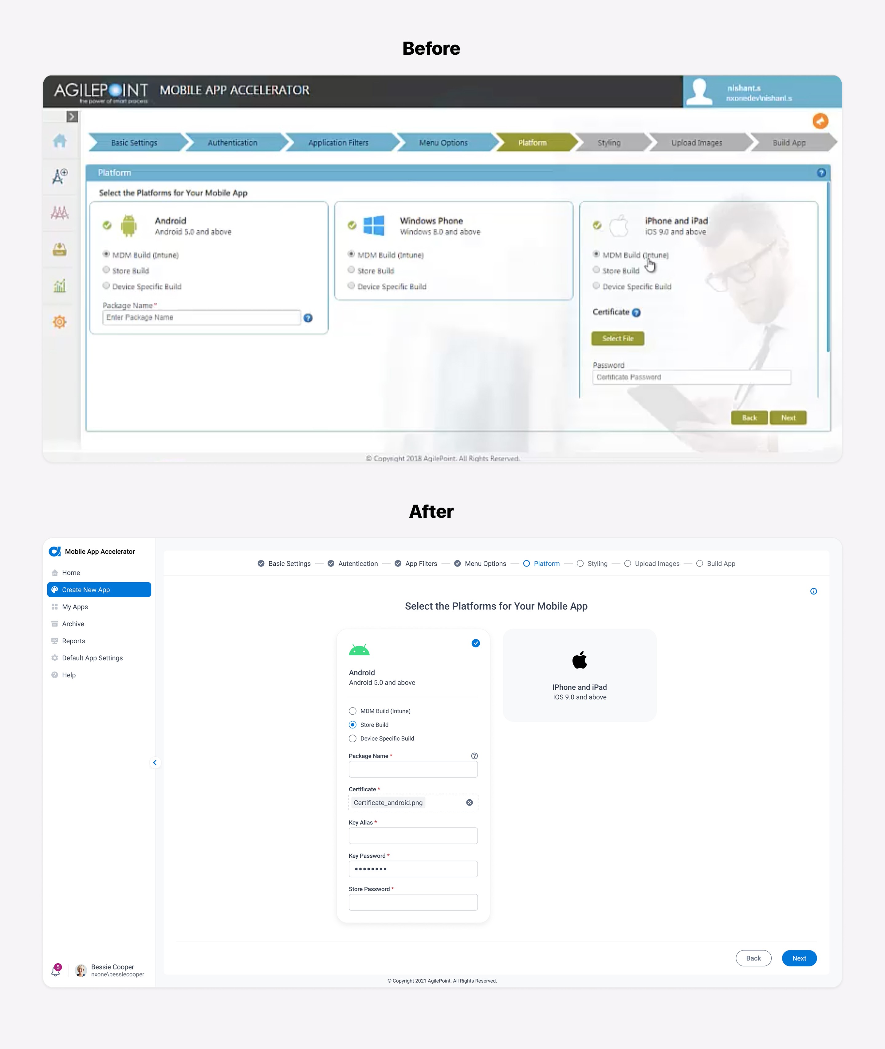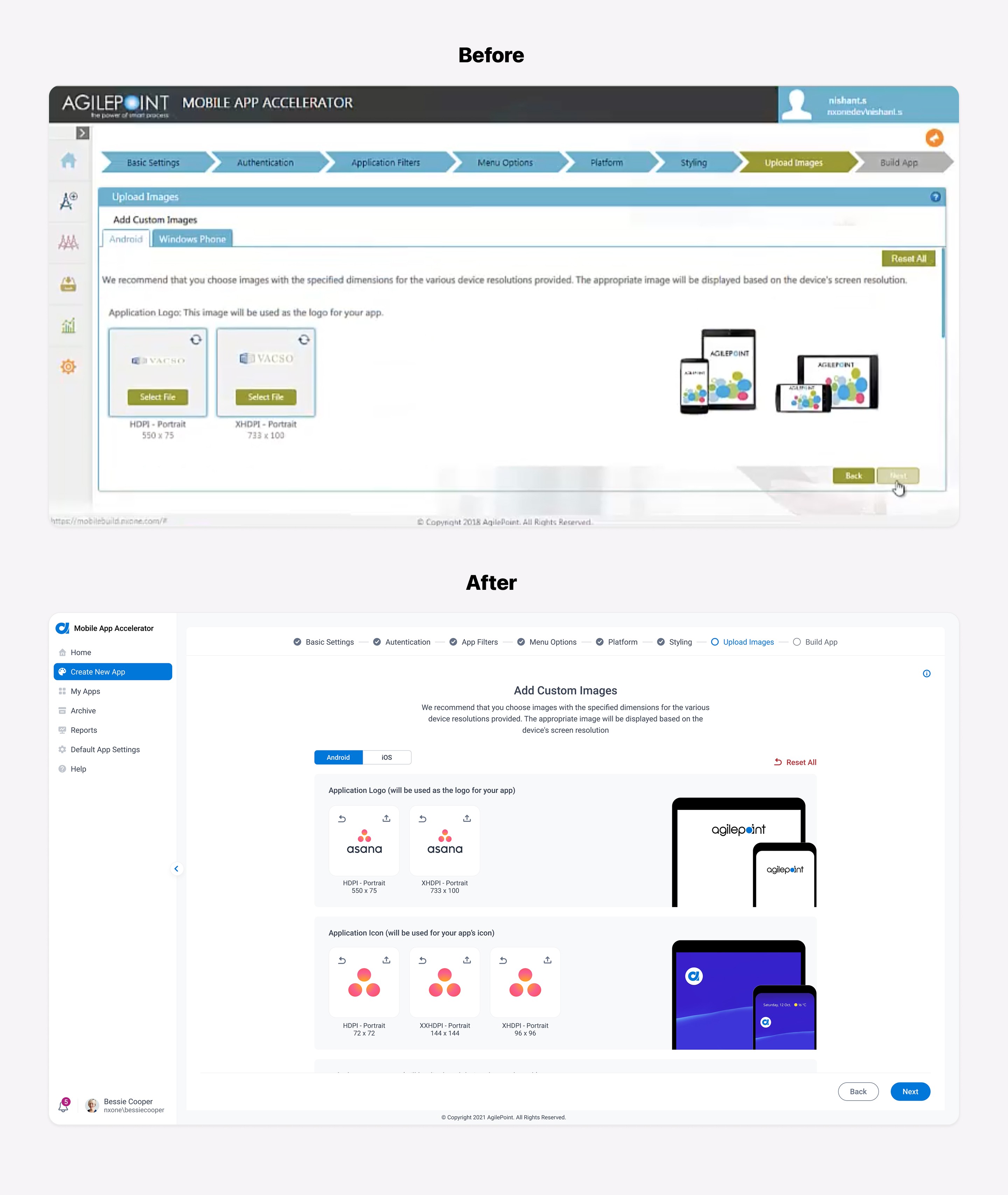 Moving forward with the process, I turned my ideas on improving usability and consistency into Hi-Fi prototypes. Below are the screens comparison showing before and after: